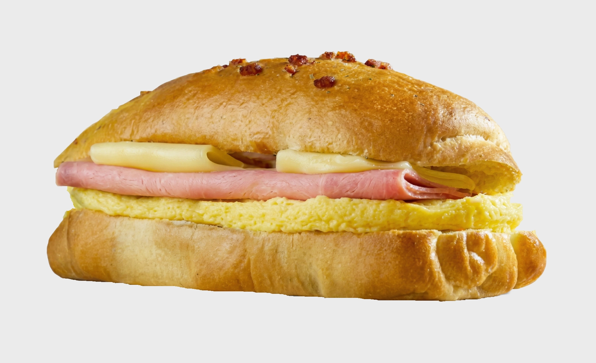 Greet the day with this amazing breakfast sandwich. A warm cheese bread with layers of gourmet swiss cheese, a delicious slice of ham and an egg omelette, the perfect combination to a fresh morning start.